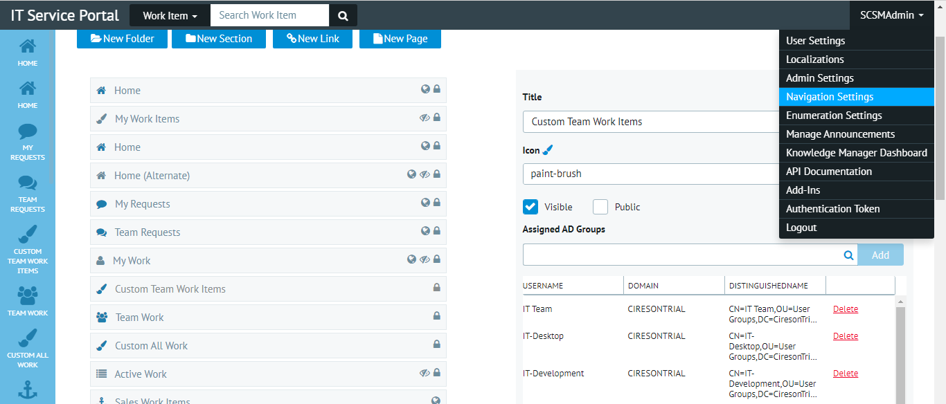 The view will then be visible in the navigation administration menu and AD user groups can be assigned to restrict who can view or use this new page.